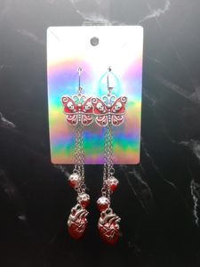 Stainless steel dangle earrings with red skull butterflies, red and clear cracked glass beads, and realistic heart charms with stainless steel leverback french earring hooks.