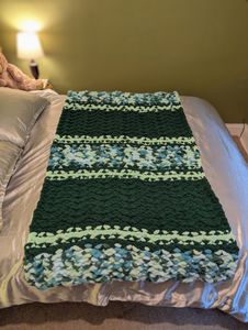 0 savesFind serenity in every stitch with the "Lake Side Forester" Blanket, a 65x42in hand-knit design that combines the calm of lakeside blues with the grounding presence of forest greens. Crafted in a butterfly stitch, its soothing green, lime, and mixed blue stripes create natural movement and texture, bringing the outdoors’ cool earthy palette indoors.